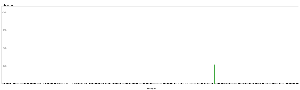 At the top of the view, the position of the antigen (identified by the corresponding HPA identifier) is shown as a green bar. A yellow triangle on the bar indicates a <100% sequence identity to the protein target.