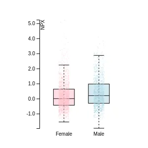 A gene is classified as upregulated in a disease if the average concentration of all samples of that disease is significantly higher (adj P-value<0.005 and NPX difference>=1) than the average concentration of samples of all diseases as measured by PEA . For gender specific diseases the analysis includes only samples corresponding to the same gender from the other diseases.