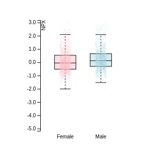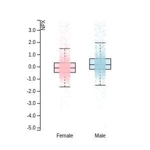 Blood protein levels in 96 healthy adults (aged 50–65) measured at six visits over a two-year period, shown separately for males and females. Relative protein abundances were quantified using the proximity extension assay (PEA) with the Olink Explore HT.