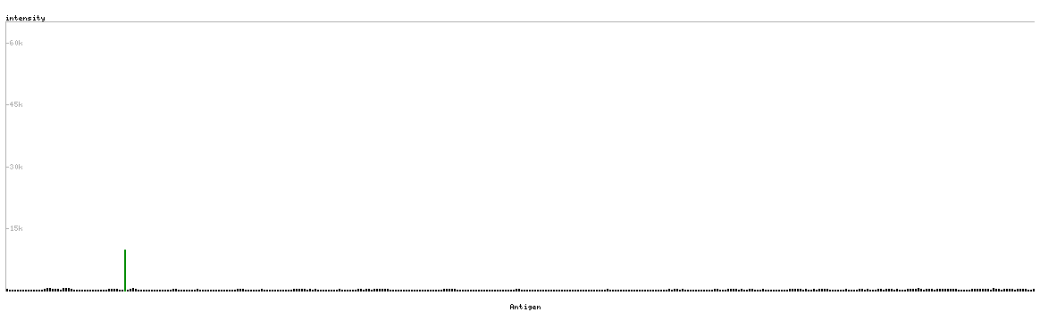 At the top of the view, the position of the antigen (identified by the corresponding HPA identifier) is shown as a green bar. A yellow triangle on the bar indicates a <100% sequence identity to the protein target.