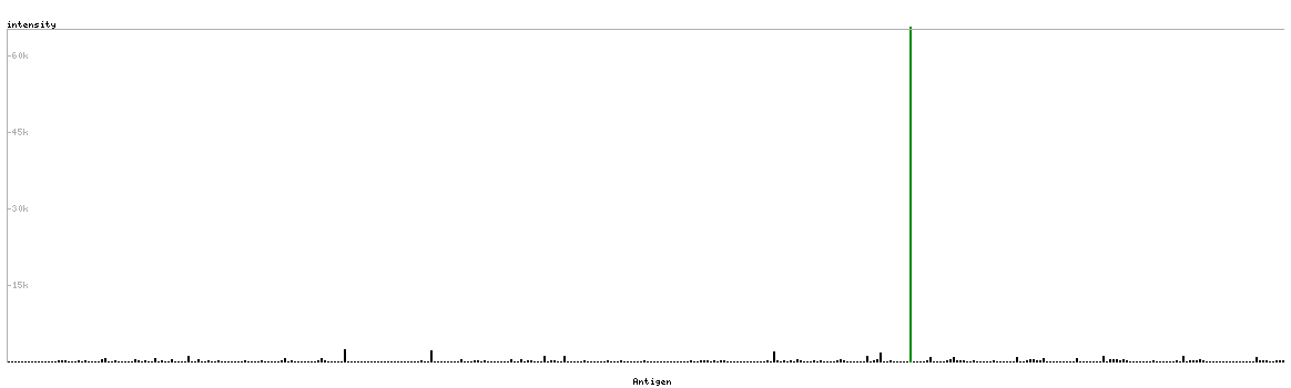At the top of the view, the position of the antigen (identified by the corresponding HPA identifier) is shown as a green bar. A yellow triangle on the bar indicates a <100% sequence identity to the protein target.