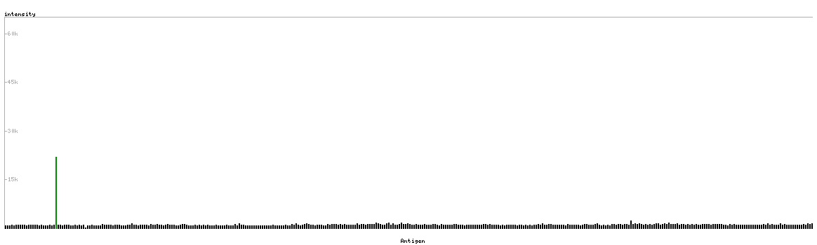 At the top of the view, the position of the antigen (identified by the corresponding HPA identifier) is shown as a green bar. A yellow triangle on the bar indicates a <100% sequence identity to the protein target.