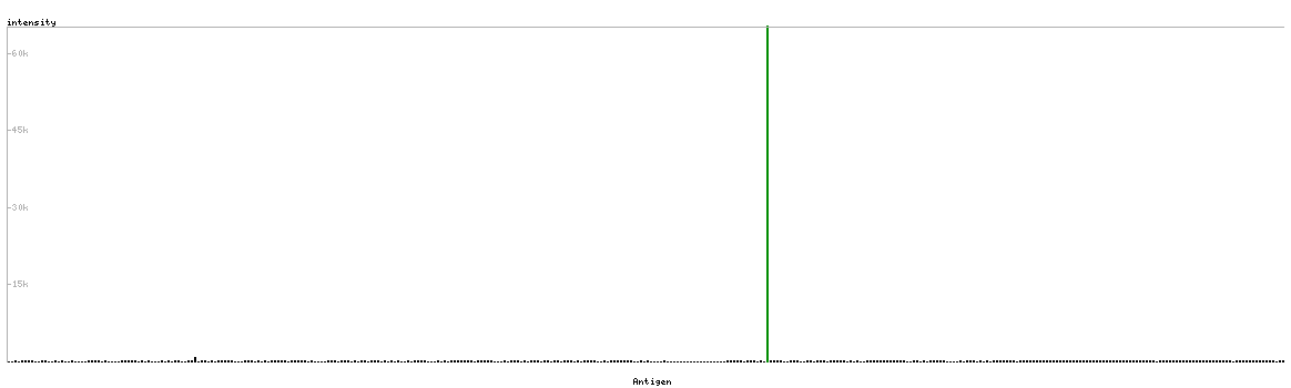 At the top of the view, the position of the antigen (identified by the corresponding HPA identifier) is shown as a green bar. A yellow triangle on the bar indicates a <100% sequence identity to the protein target.