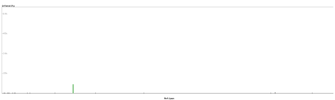 At the top of the view, the position of the antigen (identified by the corresponding HPA identifier) is shown as a green bar. A yellow triangle on the bar indicates a <100% sequence identity to the protein target.