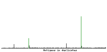 At the top of the view, the position of the antigen (identified by the corresponding HPA identifier) is shown as a green bar. A yellow triangle on the bar indicates a <100% sequence identity to the protein target.