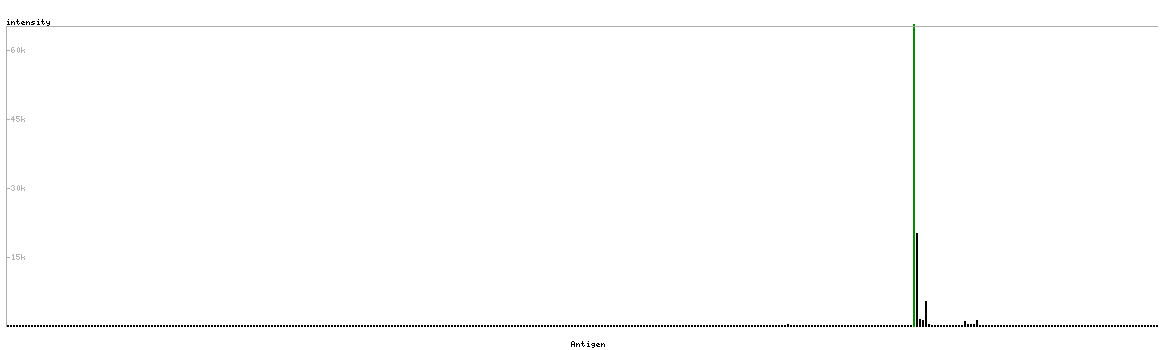 At the top of the view, the position of the antigen (identified by the corresponding HPA identifier) is shown as a green bar. A yellow triangle on the bar indicates a <100% sequence identity to the protein target.