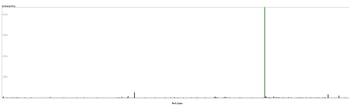 At the top of the view, the position of the antigen (identified by the corresponding HPA identifier) is shown as a green bar. A yellow triangle on the bar indicates a <100% sequence identity to the protein target.