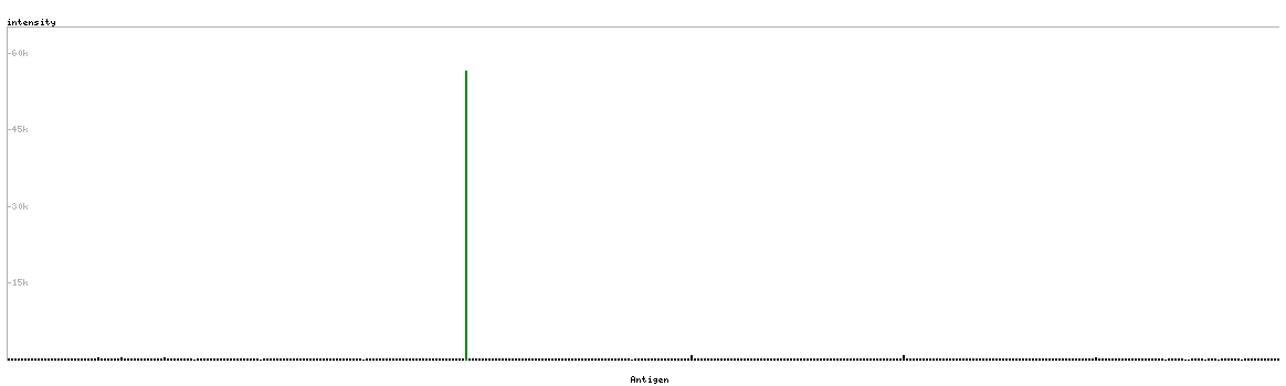 At the top of the view, the position of the antigen (identified by the corresponding HPA identifier) is shown as a green bar. A yellow triangle on the bar indicates a <100% sequence identity to the protein target.