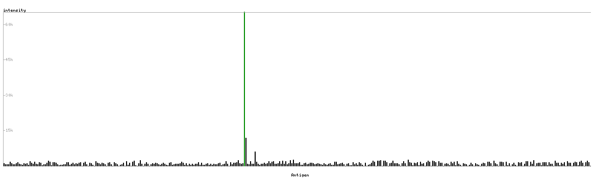 At the top of the view, the position of the antigen (identified by the corresponding HPA identifier) is shown as a green bar. A yellow triangle on the bar indicates a <100% sequence identity to the protein target.