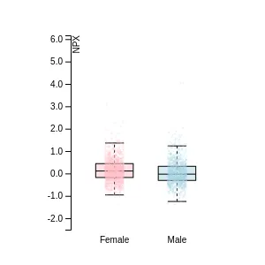 Blood protein levels in 96 healthy adults (aged 50–65) measured at six visits over a two-year period, shown separately for males and females. Relative protein abundances were quantified using the proximity extension assay (PEA) with the Olink Explore HT.