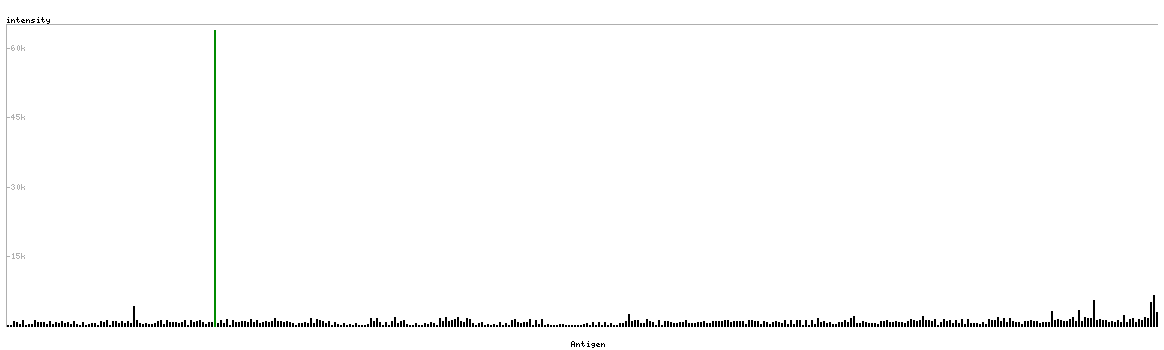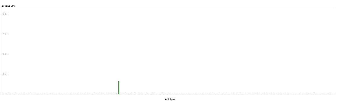 At the top of the view, the position of the antigen (identified by the corresponding HPA identifier) is shown as a green bar. A yellow triangle on the bar indicates a <100% sequence identity to the protein target.