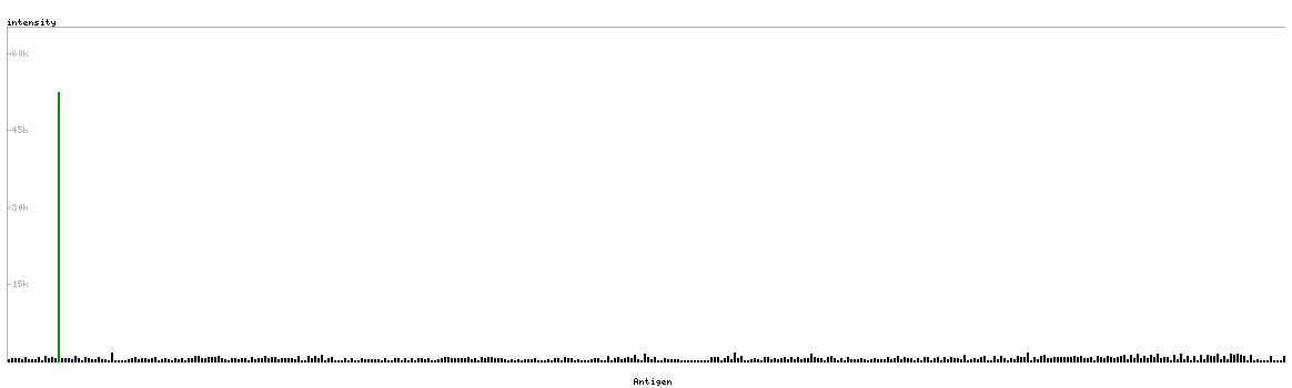 At the top of the view, the position of the antigen (identified by the corresponding HPA identifier) is shown as a green bar. A yellow triangle on the bar indicates a <100% sequence identity to the protein target.