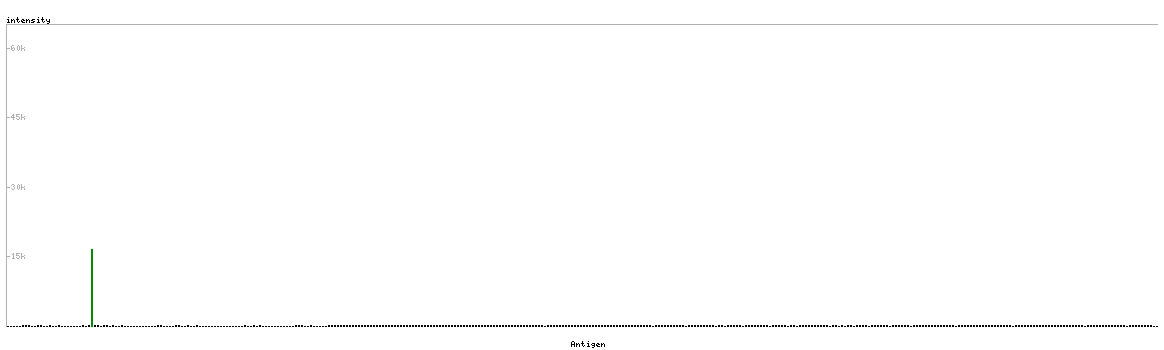 At the top of the view, the position of the antigen (identified by the corresponding HPA identifier) is shown as a green bar. A yellow triangle on the bar indicates a <100% sequence identity to the protein target.