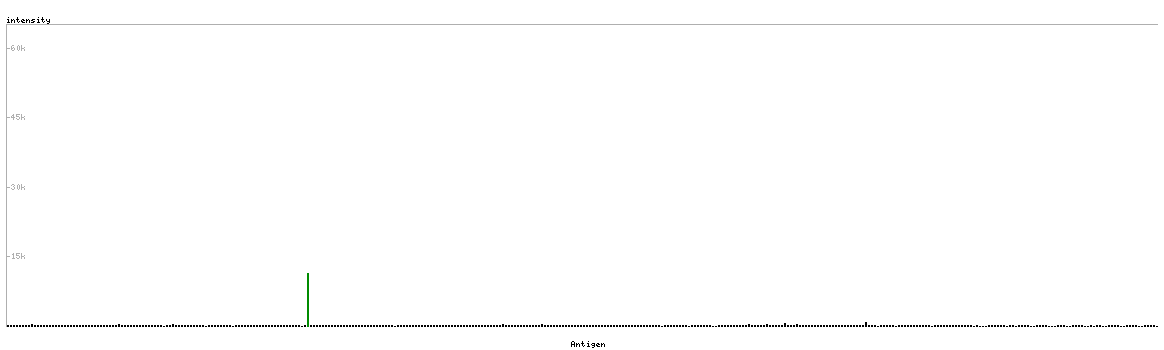 At the top of the view, the position of the antigen (identified by the corresponding HPA identifier) is shown as a green bar. A yellow triangle on the bar indicates a <100% sequence identity to the protein target.