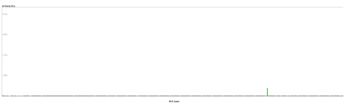 At the top of the view, the position of the antigen (identified by the corresponding HPA identifier) is shown as a green bar. A yellow triangle on the bar indicates a <100% sequence identity to the protein target.