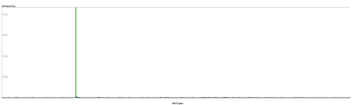 At the top of the view, the position of the antigen (identified by the corresponding HPA identifier) is shown as a green bar. A yellow triangle on the bar indicates a <100% sequence identity to the protein target.
