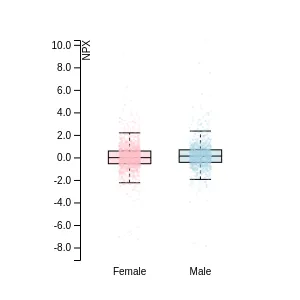 Blood protein levels in 96 healthy adults (aged 50–65) measured at six visits over a two-year period, shown separately for males and females. Relative protein abundances were quantified using the proximity extension assay (PEA) with the Olink Explore HT.