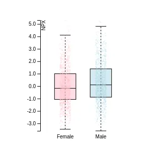 Blood protein levels in 96 healthy adults (aged 50–65) measured at six visits over a two-year period, shown separately for males and females. Relative protein abundances were quantified using the proximity extension assay (PEA) with the Olink Explore HT.