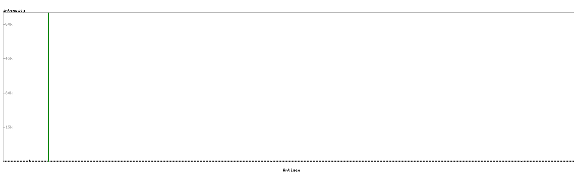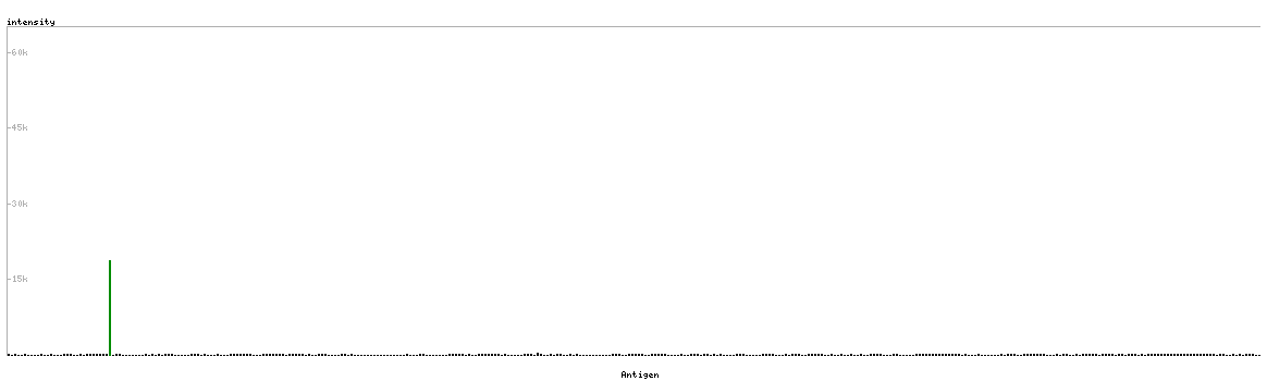At the top of the view, the position of the antigen (identified by the corresponding HPA identifier) is shown as a green bar. A yellow triangle on the bar indicates a <100% sequence identity to the protein target.
