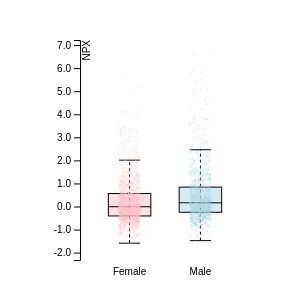 A gene is classified as upregulated in a disease if the average concentration of all samples of that disease is significantly higher (adj P-value<0.005 and NPX difference>=1) than the average concentration of samples of all diseases as measured by PEA . For gender specific diseases the analysis includes only samples corresponding to the same gender from the other diseases.