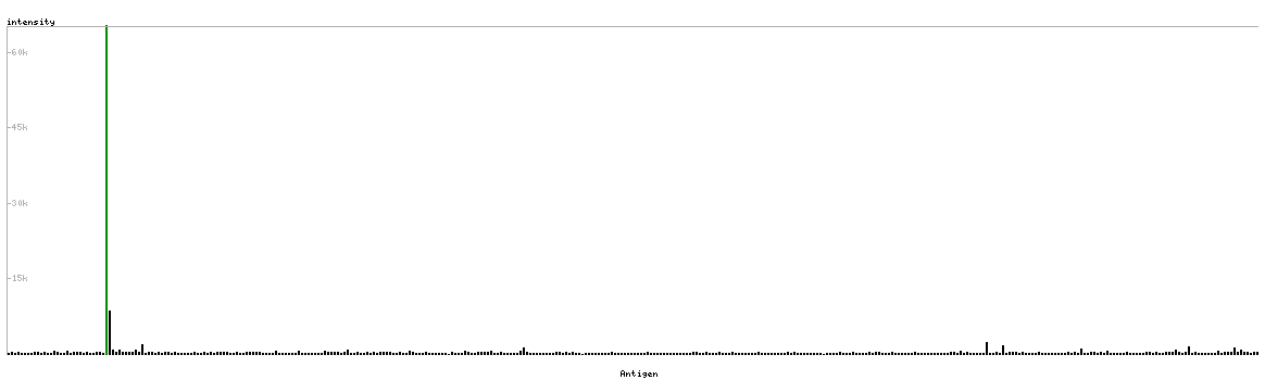 At the top of the view, the position of the antigen (identified by the corresponding HPA identifier) is shown as a green bar. A yellow triangle on the bar indicates a <100% sequence identity to the protein target.