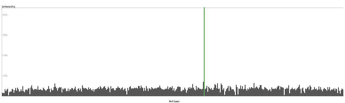 At the top of the view, the position of the antigen (identified by the corresponding HPA identifier) is shown as a green bar. A yellow triangle on the bar indicates a <100% sequence identity to the protein target.