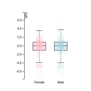 Blood protein levels in 96 healthy adults (aged 50–65) measured at six visits over a two-year period, shown separately for males and females. Relative protein abundances were quantified using the proximity extension assay (PEA) with the Olink Explore HT.
