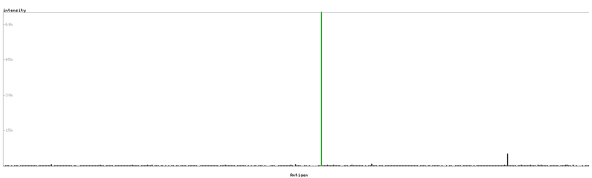 At the top of the view, the position of the antigen (identified by the corresponding HPA identifier) is shown as a green bar. A yellow triangle on the bar indicates a <100% sequence identity to the protein target.