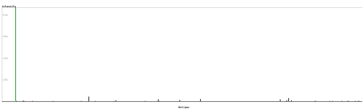 At the top of the view, the position of the antigen (identified by the corresponding HPA identifier) is shown as a green bar. A yellow triangle on the bar indicates a <100% sequence identity to the protein target.