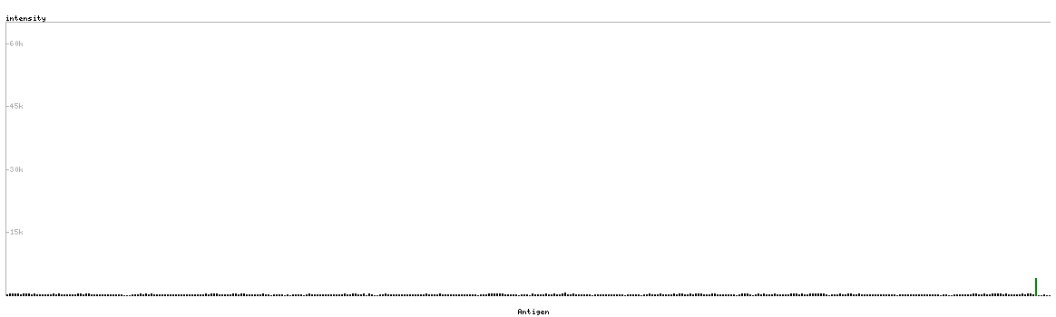 At the top of the view, the position of the antigen (identified by the corresponding HPA identifier) is shown as a green bar. A yellow triangle on the bar indicates a <100% sequence identity to the protein target.