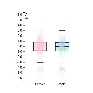Blood protein levels in 96 healthy adults (aged 50–65) measured at six visits over a two-year period, shown separately for males and females. Relative protein abundances were quantified using the proximity extension assay (PEA) with the Olink Explore HT.