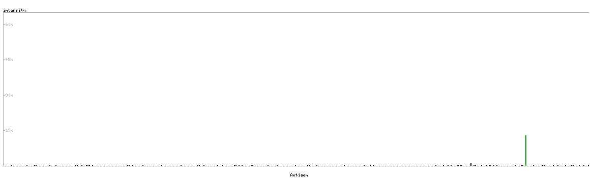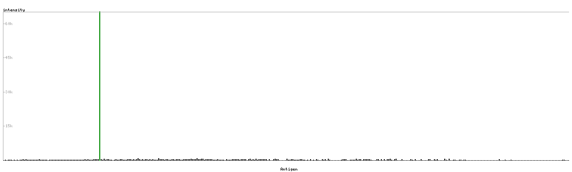 At the top of the view, the position of the antigen (identified by the corresponding HPA identifier) is shown as a green bar. A yellow triangle on the bar indicates a <100% sequence identity to the protein target.