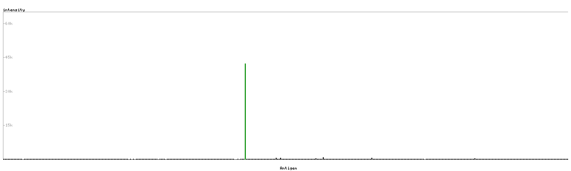 At the top of the view, the position of the antigen (identified by the corresponding HPA identifier) is shown as a green bar. A yellow triangle on the bar indicates a <100% sequence identity to the protein target.