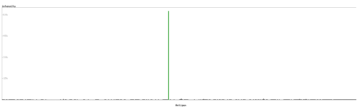 At the top of the view, the position of the antigen (identified by the corresponding HPA identifier) is shown as a green bar. A yellow triangle on the bar indicates a <100% sequence identity to the protein target.