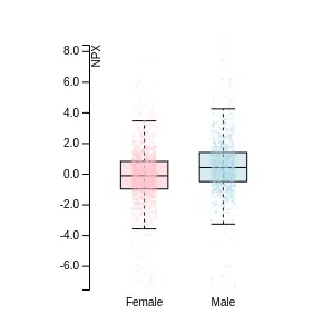 Blood protein levels in 96 healthy adults (aged 50–65) measured at six visits over a two-year period, shown separately for males and females. Relative protein abundances were quantified using the proximity extension assay (PEA) with the Olink Explore HT.