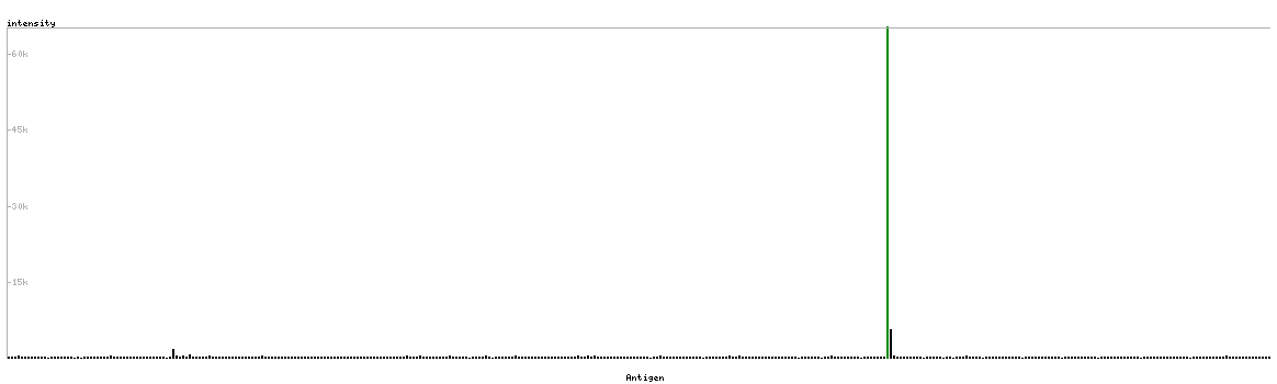 At the top of the view, the position of the antigen (identified by the corresponding HPA identifier) is shown as a green bar. A yellow triangle on the bar indicates a <100% sequence identity to the protein target.