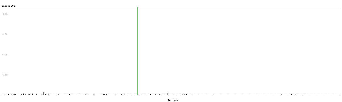 At the top of the view, the position of the antigen (identified by the corresponding HPA identifier) is shown as a green bar. A yellow triangle on the bar indicates a <100% sequence identity to the protein target.