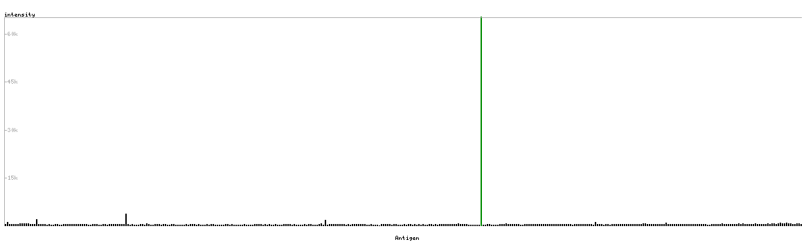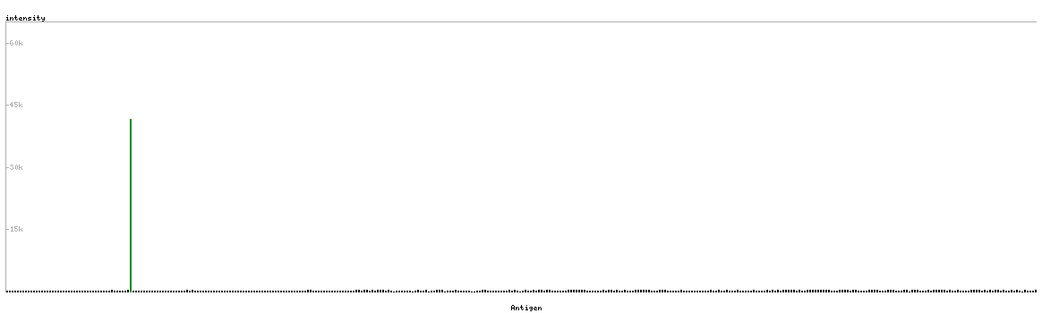 At the top of the view, the position of the antigen (identified by the corresponding HPA identifier) is shown as a green bar. A yellow triangle on the bar indicates a <100% sequence identity to the protein target.