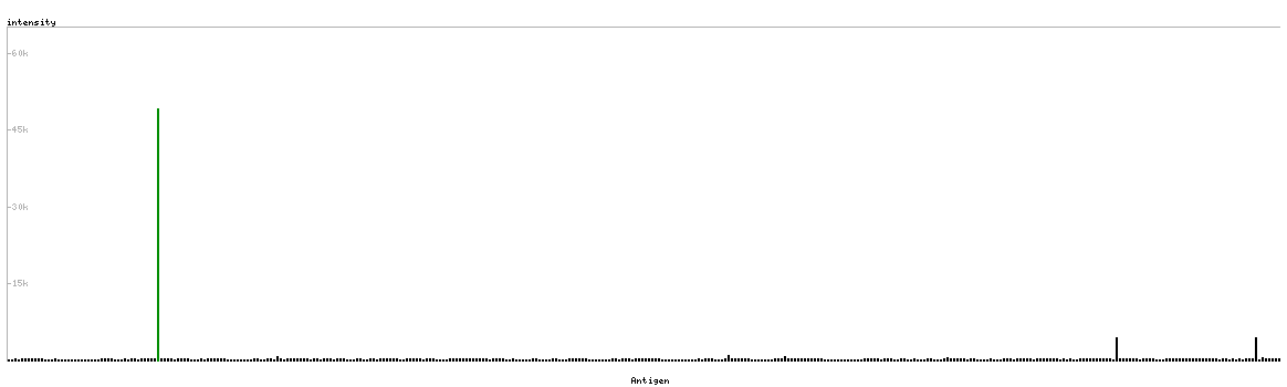 At the top of the view, the position of the antigen (identified by the corresponding HPA identifier) is shown as a green bar. A yellow triangle on the bar indicates a <100% sequence identity to the protein target.