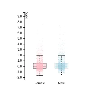 Blood protein levels in 96 healthy adults (aged 50–65) measured at six visits over a two-year period, shown separately for males and females. Relative protein abundances were quantified using the proximity extension assay (PEA) with the Olink Explore HT.