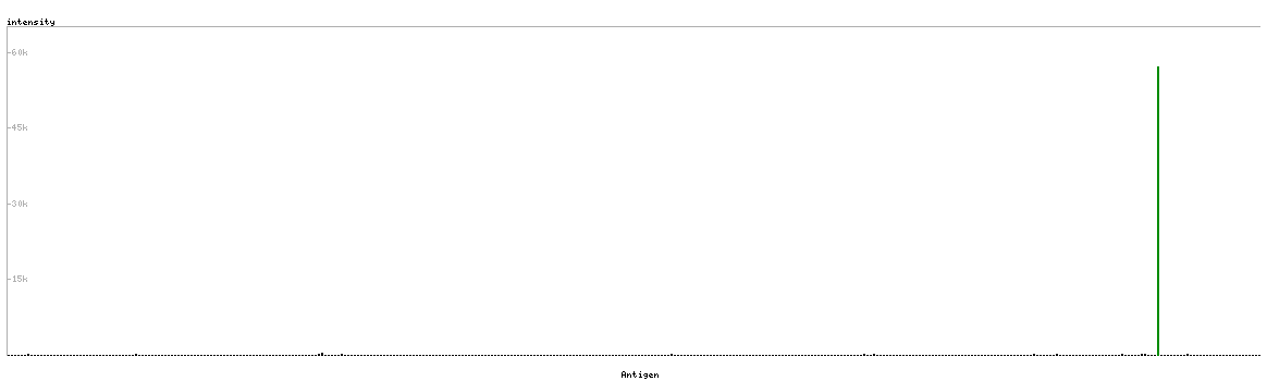 At the top of the view, the position of the antigen (identified by the corresponding HPA identifier) is shown as a green bar. A yellow triangle on the bar indicates a <100% sequence identity to the protein target.