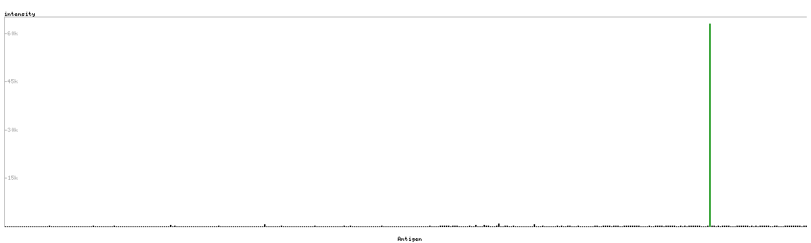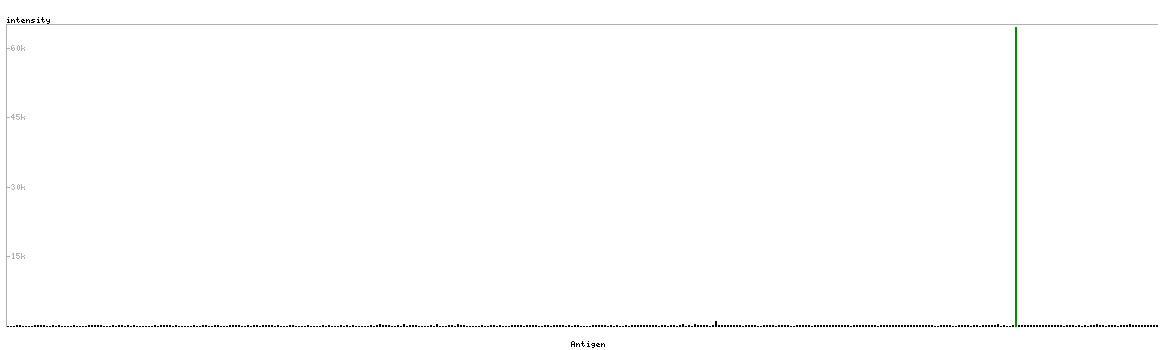 At the top of the view, the position of the antigen (identified by the corresponding HPA identifier) is shown as a green bar. A yellow triangle on the bar indicates a <100% sequence identity to the protein target.