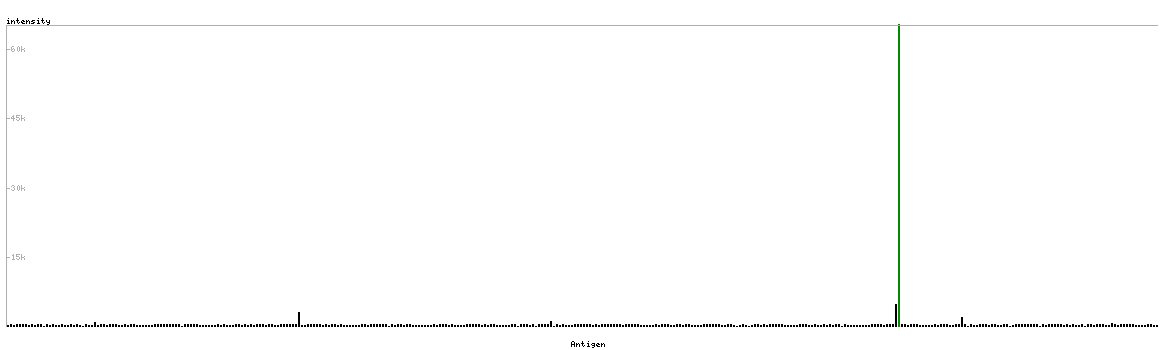 At the top of the view, the position of the antigen (identified by the corresponding HPA identifier) is shown as a green bar. A yellow triangle on the bar indicates a <100% sequence identity to the protein target.