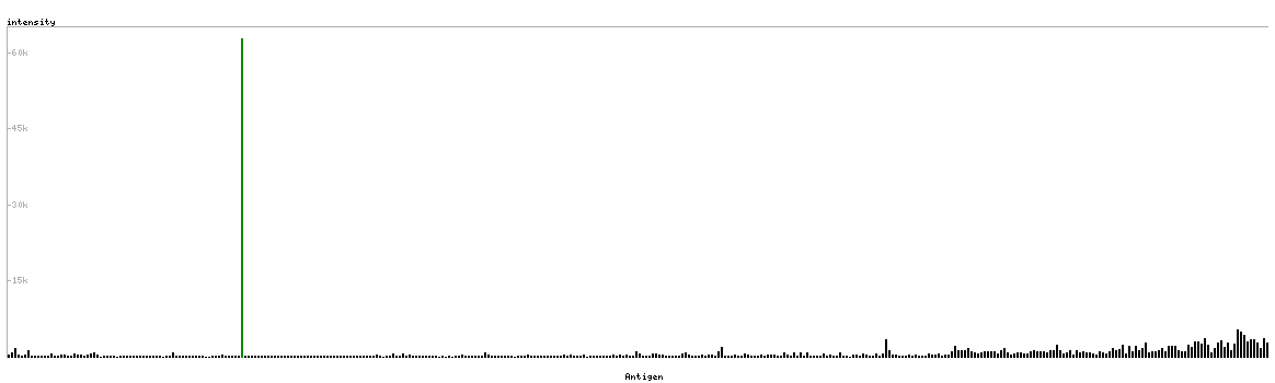 At the top of the view, the position of the antigen (identified by the corresponding HPA identifier) is shown as a green bar. A yellow triangle on the bar indicates a <100% sequence identity to the protein target.
