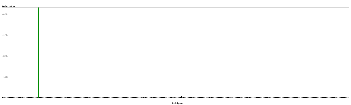 At the top of the view, the position of the antigen (identified by the corresponding HPA identifier) is shown as a green bar. A yellow triangle on the bar indicates a <100% sequence identity to the protein target.
