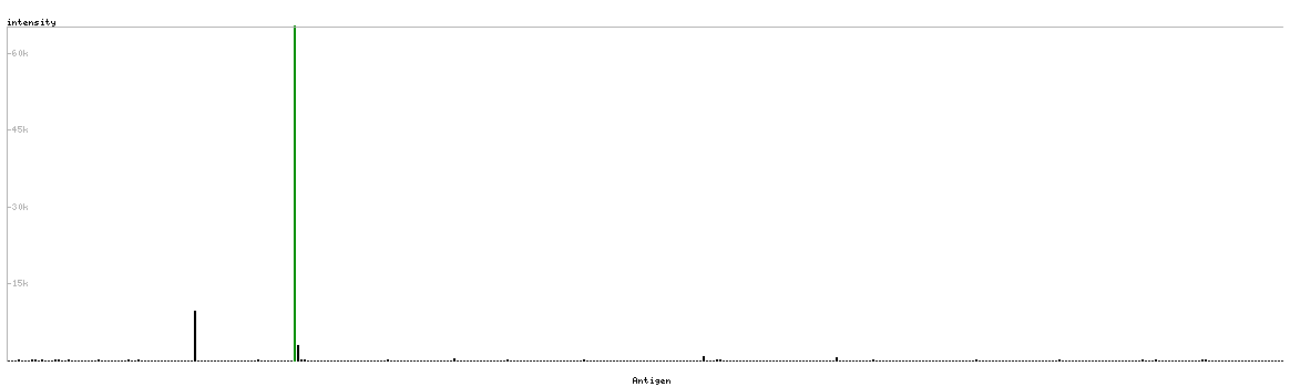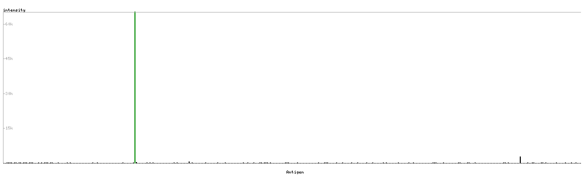At the top of the view, the position of the antigen (identified by the corresponding HPA identifier) is shown as a green bar. A yellow triangle on the bar indicates a <100% sequence identity to the protein target.