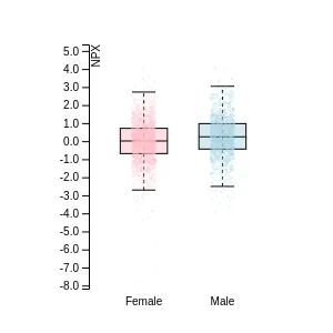 Blood protein levels in 96 healthy adults (aged 50–65) measured at six visits over a two-year period, shown separately for males and females. Relative protein abundances were quantified using the proximity extension assay (PEA) with the Olink Explore HT.