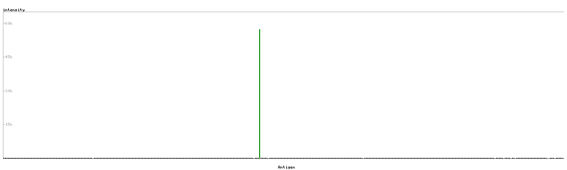 At the top of the view, the position of the antigen (identified by the corresponding HPA identifier) is shown as a green bar. A yellow triangle on the bar indicates a <100% sequence identity to the protein target.