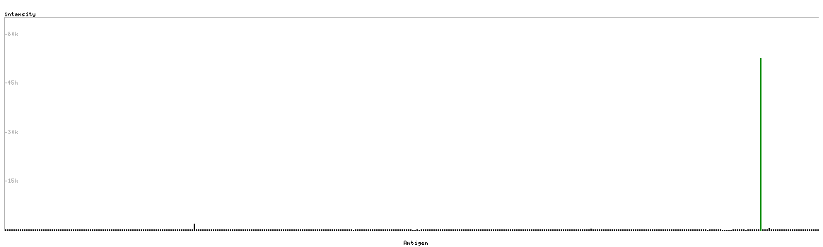 At the top of the view, the position of the antigen (identified by the corresponding HPA identifier) is shown as a green bar. A yellow triangle on the bar indicates a <100% sequence identity to the protein target.