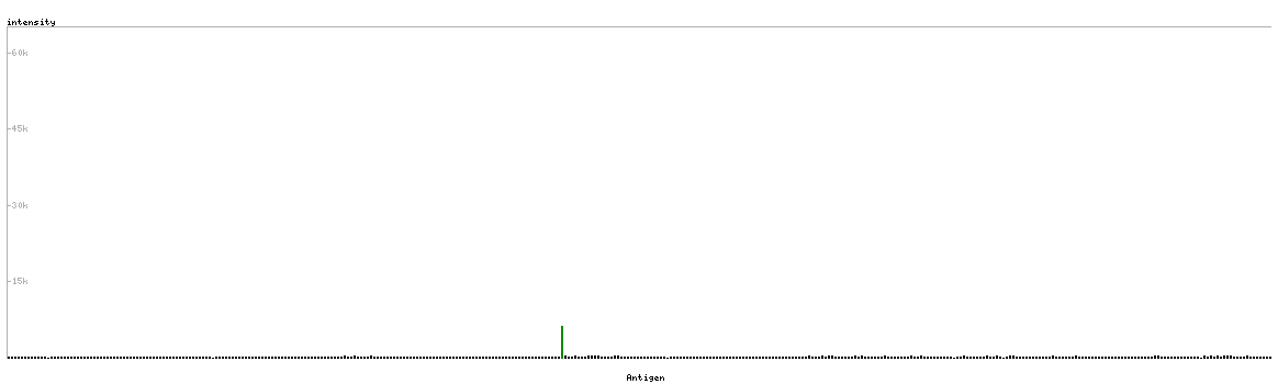 At the top of the view, the position of the antigen (identified by the corresponding HPA identifier) is shown as a green bar. A yellow triangle on the bar indicates a <100% sequence identity to the protein target.